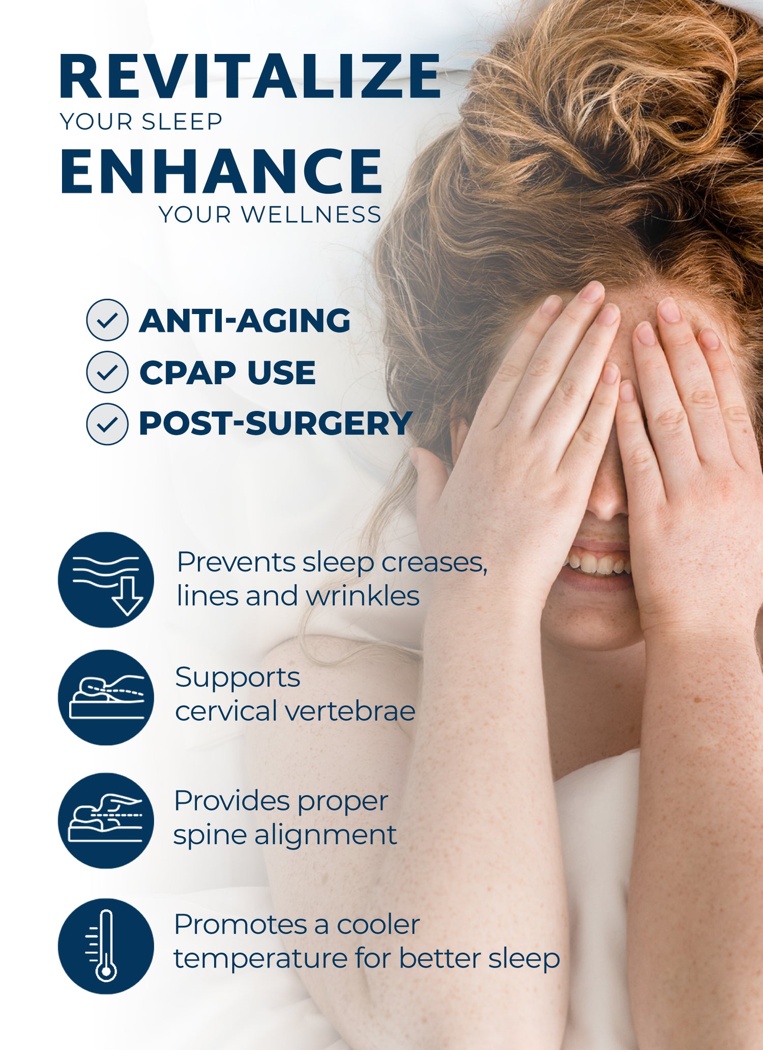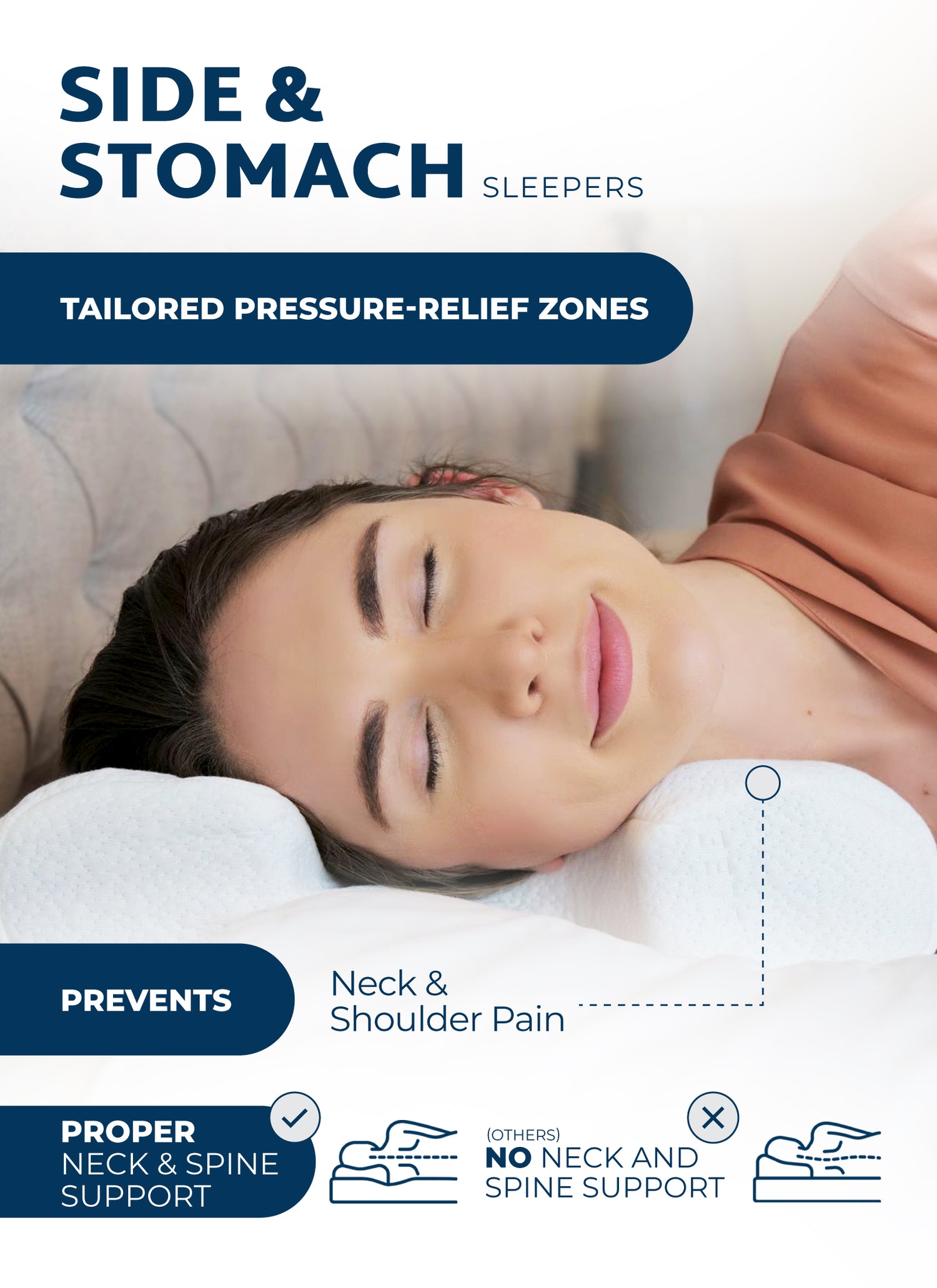 - Revolutionary/Patent Design to Prevent sleep creases - Support cervical vertebrae - Provide proper spine alignment